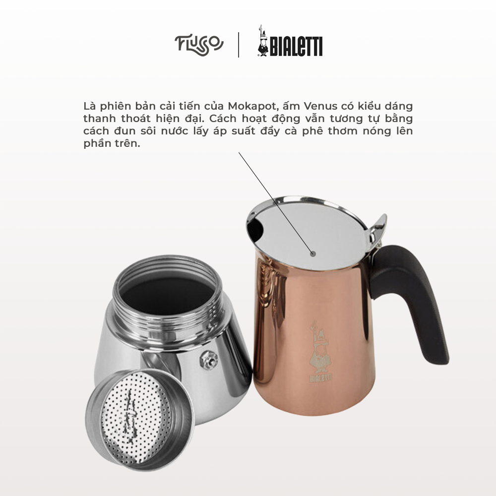 Là phiên bản cải tiến của mokapot, ấm Venus có kiểu dáng thanh thoát hiện đại. Cách hoạt động vẫn tương tự bằng cách đun sôi nước lấy áp suất đẩy cà phê thơm nóng lên phần trên.