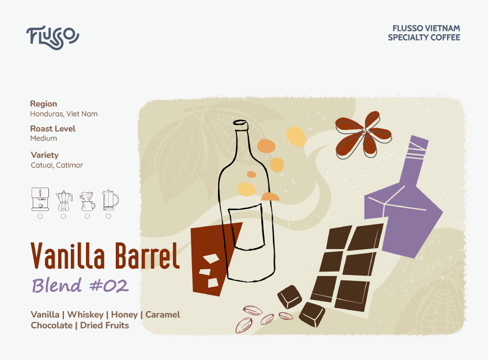 Vanilla Barrel là sự kết hợp tinh tế giữa hạt cà phê Arabica Việt Nam và cà phê Honduras. Ngay từ khoảnh khắc mở bao bì, bạn có thể ngửi thấy mùi thơm nồng nàn của whiskey vanilla, do cà phê được sơ chế đặc biệt ủ trong thùng gỗ sồi để ủ whiskey. Khi thưởng thức những ngụm đầu tiên, bạn sẽ cảm nhận được vị ngọt dịu của mật ong và chút đắng nhẹ của chocolate quyện hòa trong từng ngụm, tạo nên một bản giao hưởng hương vị khó quên. Vị ngọt mượt mà hòa cùng trái cây nhiệt đới, chocolate đen và hậu vị ấm áp, kéo dài, mang lại trải nghiệm đầy cảm xúc. Mỗi ngụm espresso Vanilla Barrel đều là một trải nghiệm đáng nhớ, đánh thức mọi giác quan của bạn.