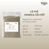 Arabica Cầu Đất Anaerobic là hạt cà phê Arabica chất lượng cao, được trồng tại cao nguyên Cầu Đất, Lâm Đồng, ở độ cao 1700 masl, nơi khí hậu mát mẻ và đất đỏ bazan giàu khoáng chất, giúp hạt cà phê phát triển chậm, tập trung hương vị đặc trưng. Giống Catimor được sơ chế Anaerobic, kỹ thuật lên men kiểm soát khí, tạo nên hương vị độc đáo và phức hợp.
