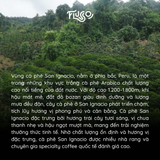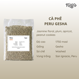 Peru Gesha là hạt cà phê Arabica Gesha chất lượng cao, được trồng tại vùng San Ignacio, Peru, ở độ cao 1750 masl, nơi khí hậu mát mẻ và đất đỏ bazan giàu khoáng chất giúp hạt cà phê phát triển chậm, tập trung hương vị đặc trưng của giống Gesha nổi tiếng. Hạt được sơ chế Washed, đảm bảo giữ trọn hương vị tinh khiết, phức hợp và thanh khiết.