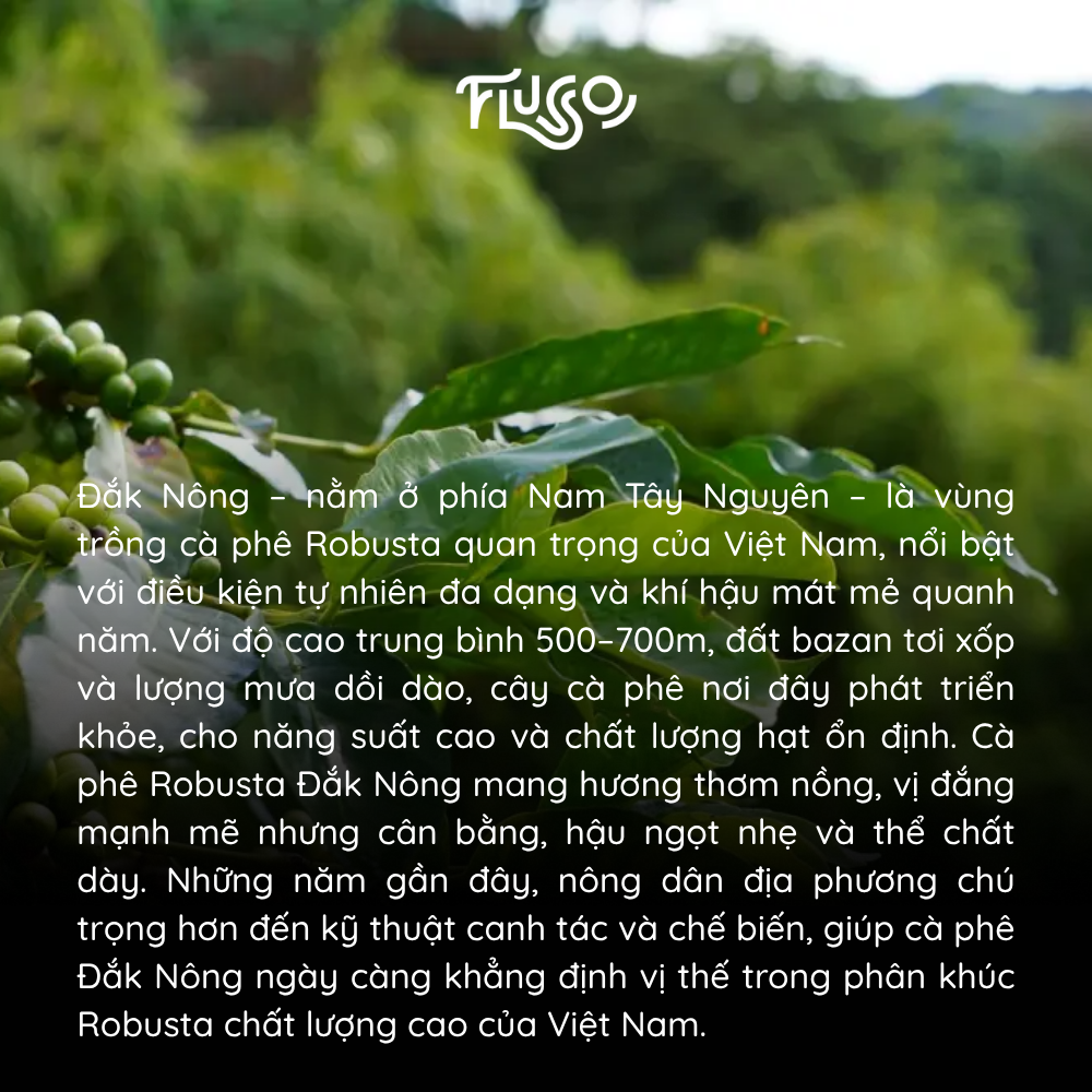 Robusta Đắk Nông Honey là hạt cà phê Robusta TR4 chất lượng cao, được trồng tại Đắk Nông, Việt Nam, ở độ cao 1000–1500 masl, nơi khí hậu mát mẻ và đất đỏ bazan giàu khoáng chất giúp hạt cà phê phát triển chậm, tập trung hương vị đặc trưng. Giống TR4 được sơ chế Honey, mang đến vị ngọt tự nhiên, cân bằng và mềm mượt.