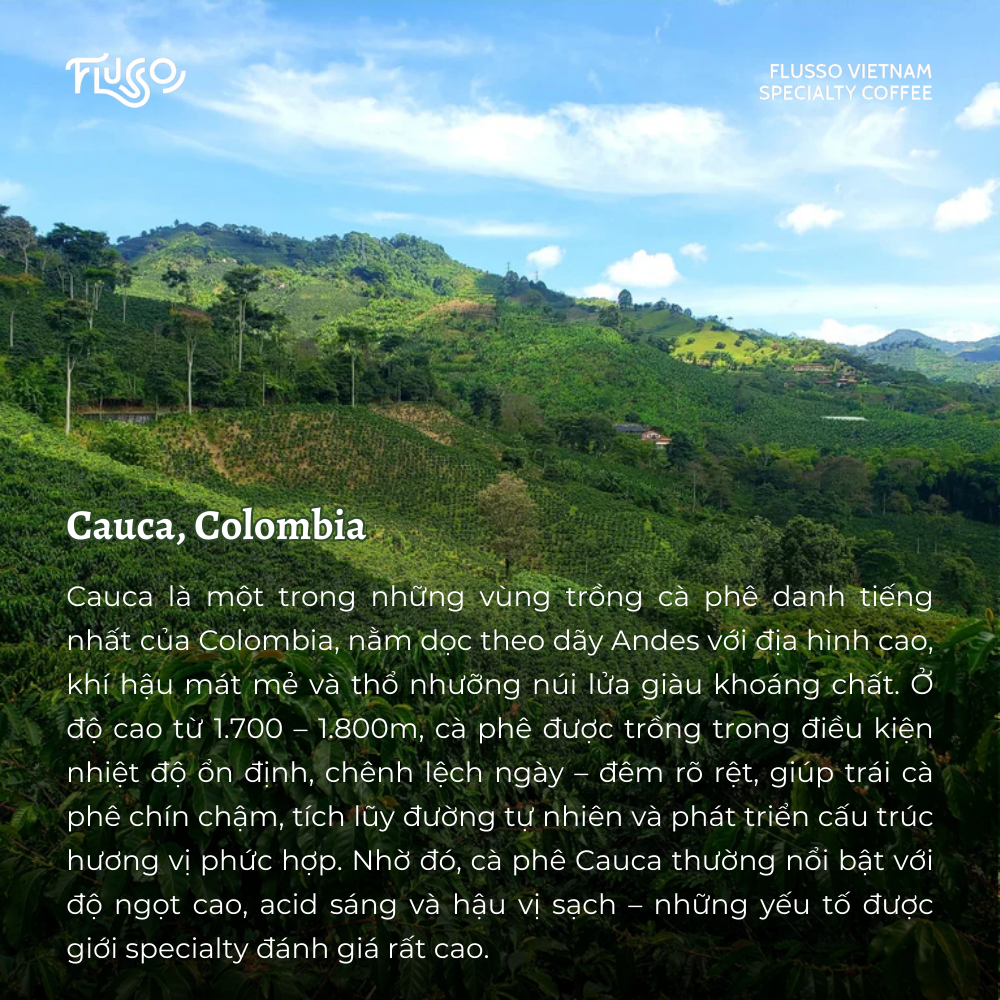 Đến từ vùng Cauca – một trong những khu vực trồng cà phê chất lượng cao nhất Colombia – El Paraiso là nông trại nổi tiếng với tư duy canh tác hiện đại và các phương pháp sơ chế tiên phong. Ở độ cao gần 1.800m, những trái cà phê Castillo được nuôi dưỡng trong điều kiện khí hậu mát mẻ, thổ nhưỡng giàu dinh dưỡng, tạo nền tảng cho hương vị sạch, sáng và độ ngọt tự nhiên vượt trội.