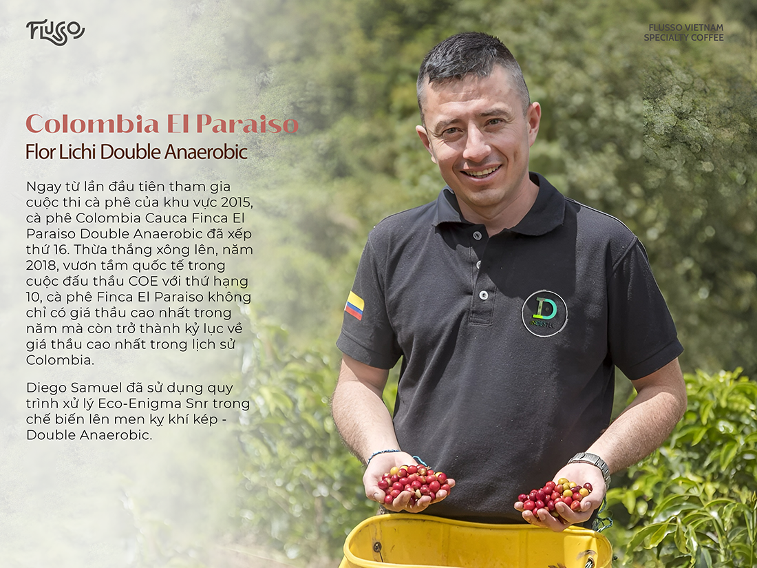 Thành lập từ 2008 bởi Diego Samuel, tại Finca El Paraiso cà phê được trồng trọt, sản xuất và chế biến bởi công nghệ tiên tiến nhất. Nhờ vào sự hỗ trợ từ công nghệ cao và đầu óc nhạy bén, Diego Samuel đã sử dụng quy trình xử lý Eco-Enigma Snr trong chế biến lên men kỵ khí kép - Double Anaerobic.