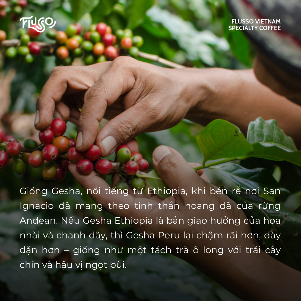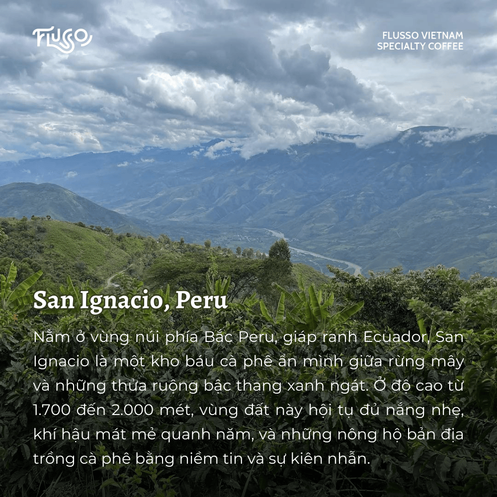 Ẩn mình giữa vùng núi Andes phía bắc Peru, trang trại của Anthony Vasquez tại San Ignacio là nơi sinh trưởng lý tưởng cho giống Gesha – giống cà phê được mệnh danh là “nữ hoàng” trong thế giới specialty coffee. Với độ cao lên đến 1.750 mét, khí hậu mát mẻ quanh năm cùng kỹ thuật canh tác tỉ mỉ, mỗi hạt cà phê ở đây đều hội tụ trọn vẹn tinh hoa của vùng đất và bàn tay người trồng.