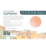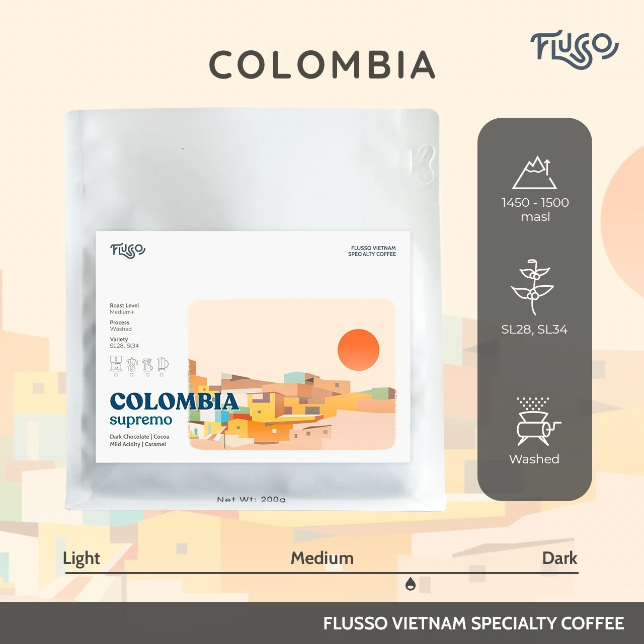 Nếu bạn hỏi Flusso về một nguyên liệu tuyệt vời dành cho espresso, Colombia Supremo luôn là loại cà phê đầu tiên mà chúng tôi nghĩ đến. Cà phê có body rất đậm và ngậy, kết hợp cùng vị ngọt cực đầm và dài của ca cao kéo dài từ đầu cho tới khi kết thúc. Bên cạnh đó là những note acid chua sáng nhưng clean và mượt mà giúp cho tổng thể hương vị cà phê sinh động hơn. Tông vị chính của Supremo là dark chocolate và ca cao; một loại cà phê ngọt lịm từ hương cho tới vị.